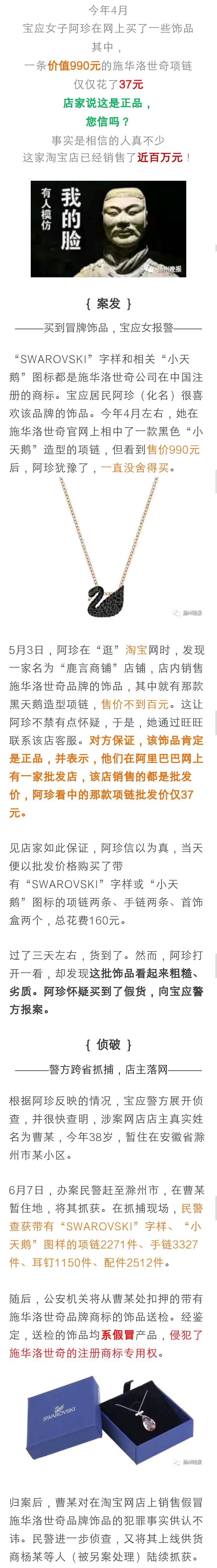 - 2017年8月24日原标题:【怪了】扬州女子淘宝上37元买到“施华洛世奇”项链,但她还是报案了……◆本文版权归原作者所有,如有侵权请联系我们根据刑法第二百一十四条之规定,销售明知是假冒注册商标的商品,销售金额数额较大的,处三年以下有期徒刑或者拘役,并处或者单处罚金;销售金额数额巨大的,处三年以上七年以下有期徒刑,并处罚金。根据最高人民法院、最高人民检察院《关于办理侵犯知识产权刑事案件具体应用法律若干问题的解释》第二条...