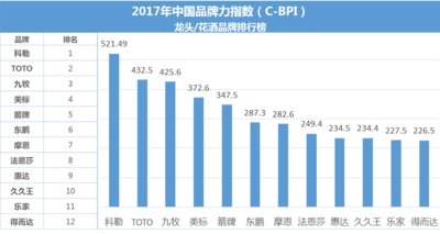 - 2017年8月22日上海2017年8月17日电//--第七届中国品牌力指数SM(C-BPI?)品牌排名和分析报告发布,科勒再登“龙头、花洒排行榜”第一,继续领跑行业。中国品牌力指数SM(C-BPI?)被誉为消费者和企业最信赖的品牌评价制度,自2011年发布以来的七年中,科勒已在龙头、花洒排行榜里5次夺魁。2017中国品牌力指数龙头/花洒品牌排行榜中国品牌力指数(ChinaBrandPowerIndex,简称:C-BP...