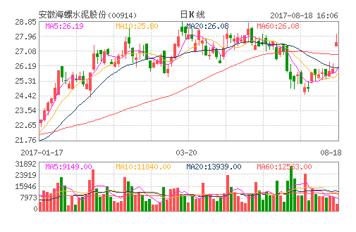 - 2017年8月20日港交所最新资料显示,安徽海螺水泥股份(00914)主要股东SchrodersPlc于2017年8月14日,场内减持公司好仓40.8万股,套现1169.0628万港币,成交均价28.6535港币,最高成交价28.75港币。变动后持有权益6473.85万股,于公司已发行股份占比4.98%。...