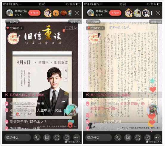 - 2017年8月17日在今年的电视荧屏上,人气小生邓伦开始他的霸屏模式,接连在《欢乐颂2》、《楚乔传》、《白鹿原》三部热播大剧中扮演重要角色,并且对剧中不同角色的精彩演绎受到网友、媒体的一致好评。8月9日,邓伦做客红豆Live《旧信重读》节目,深情朗读了一封革命先烈写给自己爱人的家信,充沛的感情加上磁性的嗓音深刻演绎了信中那段纯真的革命爱情。据了解,信中主人公袁学群、李若茜两位烈士生前在长春从事地下工作,1948年长春...
