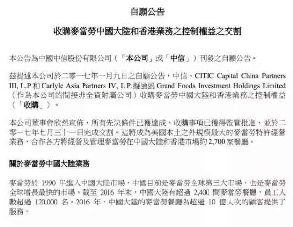 - 2017年8月17日原标题:继肯德基中国之后,麦当劳中国再被收购,我们的快餐会变味吗?8月8日,一打开手机看新闻,就发现:麦当劳中国被收购了。据中信股份发布公告,今年1月9日,双方已签订了股份购买协议,以最高20.8亿美元的总对价收购麦当劳中国管理有限公司,连同其附属公司的全部已发行股本。已于2017年7月31日顺利完成交割。交割完成后,中信股份和中信资本在新公司中将持有52%股权,凯雷和麦当劳分别持有28%和20%...