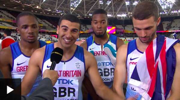 - 2017年8月13日夺冠后的英国队正在接受采访自动播放开关自动播放申诉?慢镜头回放苏炳添接棒遭英国队影响降速正在加载...腾讯体育讯一场意外的4×100米大戏在伦敦碗上演,笑到最后居然是半路里杀出来的东道主英国队。夺冠大热美国队和牙买加一个饮恨,一个没有完赛,让人唏嘘。英国队夺冠的狂喜是建立在中国队的失落之上的。若不是临道的英国队第二棒格米利在交接棒后,给了苏炳添“一肘子”,打蒙了的苏炳添不得不减速,有可能站在第三名...