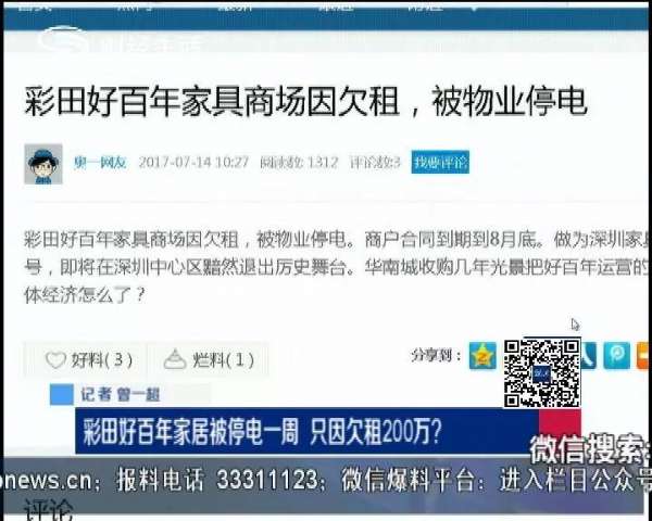 - 2017年8月13日位于福田区彩田路的好百年家居商城,相信不少人都知道,这里是深圳最早的高端家具卖场,然而,近期有商户在网上发帖称,彩田好百年家居商场因为欠租,被物业停电,这到底是怎么回事呢?近日,在奥一网上有商户报料称,彩田好百年家居商场因为欠租,被物业停电,并提出了作为深圳家具品牌的老字号,好百年即将在深圳中心区黯然退出历史舞台的质疑。今天,记者也来到彩田路的好百年家居商场,虽然已经恢复了供电,但是商场内一片冷清...