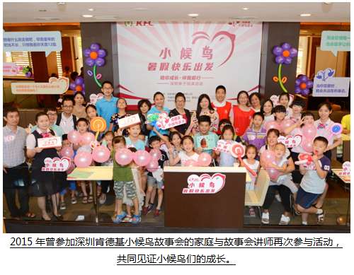 - 2017年8月13日原标题:深圳肯德基小候鸟故事会暑假从”心”出发每年暑假,深圳都会出现一类特别的群体,他们从全国各地来到深圳与爸爸妈妈团聚,在深圳度过两个月的快乐时光再回到家乡读书学习,他们就是可爱的“小候鸟”。今年暑假,深圳肯德基为小候鸟群体准备了四场从“心”出发的故事会,通过小候鸟故事会亲子阅读的形式以及心理学专家在亲子沟通上的指导,把“小候鸟”们与家长之间由于物理距离而产生的心理距离有意识的“缩短”,从而帮助...