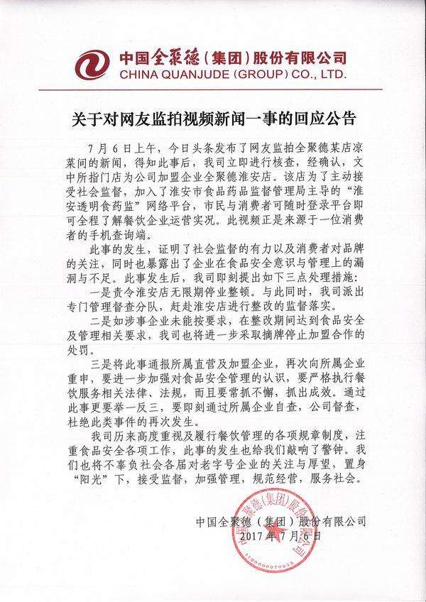 - 2017年8月11日【原标题】全聚德后厨不卫生网友纷纷表示招牌被砸目前该店以停业整顿―来源:楚秀网―编辑:王琦全聚德后厨不卫生网友纷纷表示招牌被砸目前该店以停业整顿不戴口罩、用手拿东西吃、抹布擦盘子、配餐期间玩手机……近日,一段全聚德后厨内,疑似操作不卫生的视频,将其推上舆论风口。随后,有网友指出,该后厨为全聚德北京地区的一家店。全聚德后厨不卫生网友纷纷表示招牌被砸目前该店以停业整顿视频热传后,随即引发众多关注。7月...