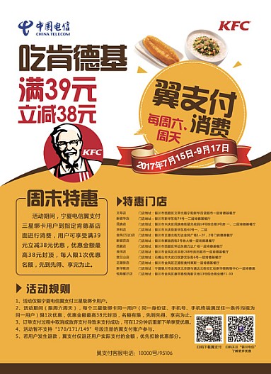 - 2017年8月9日在物价飞涨的今天,一块钱还能买什么呢?可以买一瓶矿泉水,可以坐一次公交车,但让人万万没想到的是,一元钱还能吃上肯德基:使用翼支付APP付款码扫码付款,立减38元,实付1元。7月15日-9月17日,每周六日,宁夏电信翼支付用户在银川市指定肯德基消费,有机会享受满39元立减38元优惠!这是中国电信旗下第三方支付平台翼支付接入宁夏、安徽、江苏、四川成都、天津等地的肯德基餐厅后,在宁夏肯德基所做的一场线下...
