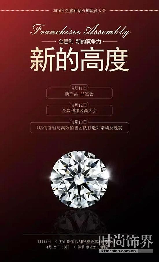 - 2017年8月8日《金嘉利新的高度新的竞争力》2016年金嘉利钻石加盟商大会将于2016年4月11日-2016年4月13日在深圳盛大召开。届时有金嘉利全新产品发布、优秀加盟商颁奖、优秀加盟商成功经营经验访谈、珠宝大咖行业趋势交流;国内知名培训大师专程为您讲授《店铺经营管理与高效销售团队打造》,为您打造高效益、高回报的店铺管理模式;并有神秘明星嘉宾出席,与您共庆大会盛世。金嘉利钻石诚邀您的莅临!...