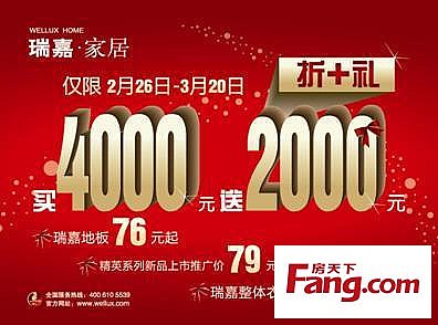 - 2017年8月5日瑞雪迎春到,嘉礼满京城。瑞嘉地板3.15感恩大奉送,买4000送2000。瑞嘉地板76元起;瑞嘉整体衣柜、木门全场8折。皑皑白雪不能拭去,这初春绒绒的暖意,瑞嘉地板3.15感恩大行动正在火热上演进行时,超低的折扣,丰厚的礼金,让这个物价飞涨的时代不再晦涩,买4000元送2000元。瑞嘉地板76元起;瑞嘉整体衣柜、木门全场8折。著名演员濮存昕倾情代言,相信在“一切为家”企业文化下,瑞嘉会与您共建一个...
