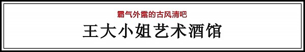 - 2017年8月4日古时的人,文人雅士热爱吟诗作对,棋逢对手也不免要饮上一壶好酒。无论是古味还是今朝,生活情趣都少不了酒和美食。有色有味有酒,在江城,偏偏也有着这些别出心裁的小馆,一不小心踏进去,就在这古色古香中醉一回!——客官,您要的女儿红!泰兴里这附近很多各种大大小小的咖啡馆和清吧,许多人盛夏夜晚,压着马路就自然地走进了这里。大名鼎鼎的中国风文字清吧——王大小姐艺术酒馆,霸气外露的古风清吧,前身却是是一家闻名江城...