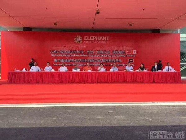 - 2017年8月1日7月26日,大象红枫叶新材料科技有限公司(下称:大象红枫叶)揭牌典礼暨与柬埔寨丰龙华建材有限公司销售签约典礼在苏州隆重举行。中国记协党组书记翟先生、江苏省原王副省长、江苏省原政协陆副主席、中国涂料工业协会阎秘书长、吴江区委陈副书记、吴江经济开发区经济发展局颜局长、吴江银行庄行长、美国QEP国际建材集团Boiardi品牌亚太地区首席代表林先生、俄罗斯外贸银行公开股份公司上海分行行长巴莎先生、加拿大G...