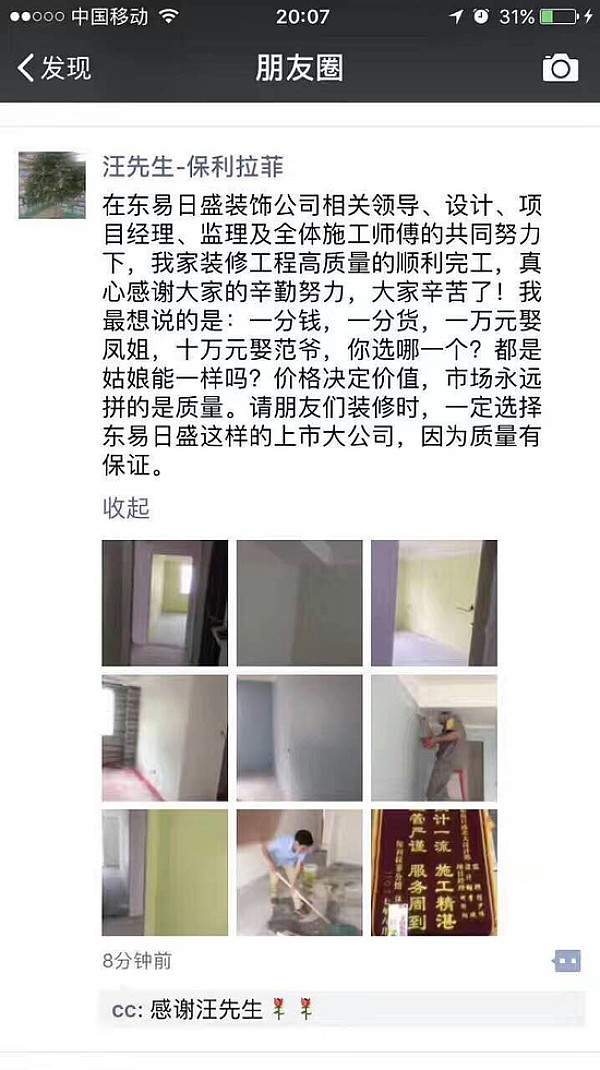 - 2017年8月1日东易日盛怎么样?我们说好不算好,只有装修过的业主说好,那才是真的好。用诚意说话,用工作说话,只有业主满意了,我们“装饰美好空间、筑就幸福生活”的使命才真正变得有价值。东易日盛怎么样?一条朋友圈告诉您真相。昨晚在朋友圈看到业主更新的动态,觉得十分有意思又特别感动。“在东易日盛装饰公司相关领导、设计、项目经理、监理及全体施工师傅的共同努力下,我家装修工程高质量的顺利完工,真心感谢大家的辛勤努力,大家辛...