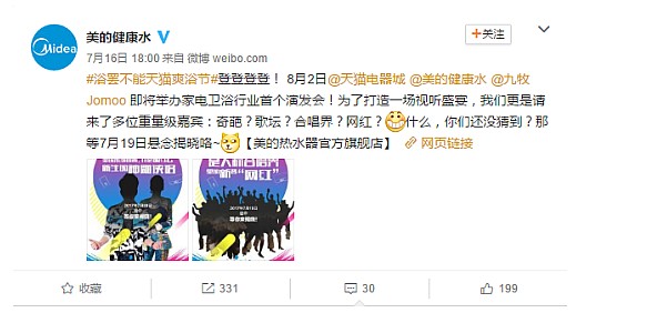 - 2017年7月29日8月2日,天猫&美的热水器“浴罢不能”爽浴节即将举行家电行业首个#净享极智浴罢不能#演发会,此消息一经发出便引发网友热议,美的为了打造一场歌话剧演唱形式的视听盛宴,更是请来了多位重量级嘉宾,目前还处于保密阶段的嘉宾阵容引起媒体与网友的各种猜测。据悉,此次#净享极智浴罢不能#演发会,邀请合唱界里的新晋“网红”以合唱的形式,开启全球首场“浴罢不能”演发会;另外还有“奇葩说”里两位神秘嘉宾加盟,一位是号...