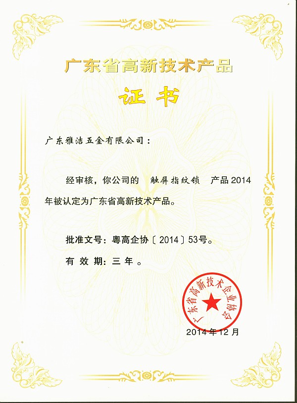 - 2017年7月29日近日,雅洁五金触屏指纹锁再次凭借技术创新,被广东省高新技术企业协会认定为“广东省高新技术产品”。自2011年,雅洁触屏指纹锁诞生,成为国内首款触屏指纹锁,为行业画上了历史性的一笔。几年来,雅洁触屏指纹锁,不断刷新触屏开锁的时间记录,让用户在快生活中尽享一触即开的便利;不断填补行业技术空白,将抗菌率高达99%的“抗菌防护技术”应用于触屏指纹锁;不断改写行业里程碑,七层电镀艺术打造宽广色域,更多色彩可...