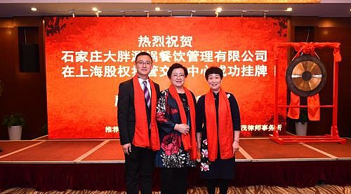 - 2017年7月28日(原标题:热烈庆贺大胖涮锅在上海股交中心成功挂牌上市)2016年3月25日,石家庄大胖涮锅餐饮有限公司在上海股权托管交易中心正式挂牌上市,股权代码“208903”,成为中国首家骨汤火锅挂牌上市的餐饮连锁企业。上海股权交易中心领导为大胖涮锅餐饮有限公司颁发了纪念牌,12点58分,在众人的期待下,董事长成荣芹女士敲响了挂牌上市的锣声,这标志着大胖涮锅成功对接资本市场,成为一家公众型企业,是其进入了一个...