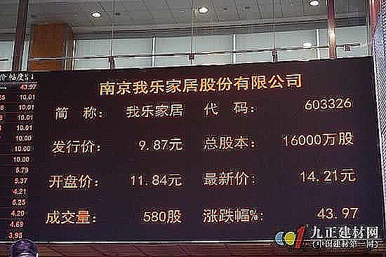 - 2017年7月27日6月16日,南京我乐家居(603326)股份有限公司在上海证券交易所成功上市,股票简称为“我乐家居(603326)”,证券代码为“我乐家居(603326)”,保荐券商为招商证券。上市仪式上,我乐家居(603326)董事长缪妍缇与南京江宁开发区管委会副主任王爱军共同敲响了上市锣。我乐家居(603326)成立于2005年,秉承“设计让家更美,科技让美实现”的理念和使命,在12年的企业发展历程中,我乐家...