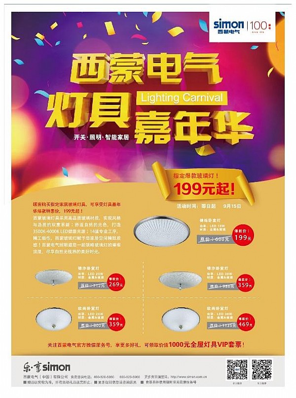 - 2017年7月24日SimHOME店灯具嘉年华,惊喜停不下!惊喜一:指定玻璃灯199元起,数量有限,先到先得;惊喜二:价值1000元的全屋灯具VIP套票免费领关注服务号“simon西蒙电气“,即可领取1000元灯具套票惊喜三:到店无需消费,凭券还可获得神秘到店礼一份惊喜四:1元换购筒灯;凡整单购买筒射灯产品每满10只,凭券可享1元购晶亮系列4W筒灯1只惊喜五:指定灯具产品,凭券还可享受满3000元立减300元!还等什...