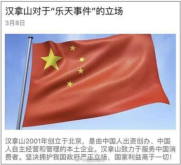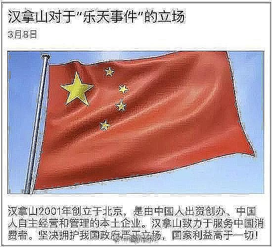 - 2017年7月23日(原标题:汉拿山、权金城等餐厅纷纷发声明:我们百分百是中国的)最近,乐天集团与韩国防部签署“萨德”换地协议,引发了中国民众抗议,尤其随着“萨德”装备抵韩,民间对韩的不满情绪也日益强烈。对此,国内一些与“韩国元素”有关的企业发出声明,明确自己与“乐天”无关。汉拿山于2001年创立于北京,是由中国人出资创办,中国人自主经营和管理的本土企业。“我们是百分百中资企业。未使用和销售过乐天的产品,未来也坚决不...