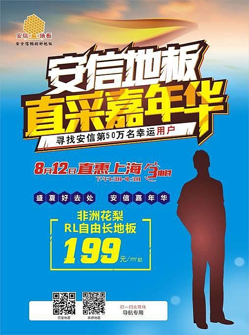 - 2017年7月22日盛夏酷暑去哪儿?来国内高端实木地板领导者“安信地板直采嘉年华”吧。8月12日,安信地板直采嘉年华限时直惠上海。据了解,本次活动中,安信地板精选热销产品,嘉年华劲爆价让利用户。在活动现场中,将寻找出神秘的安信第50万个幸运用户,更有精美礼品相赠。还有抽奖盛宴等你来参加和精美家私好礼送完为止。精选优质地板,限时直惠上海本次嘉年华活动中,安信地板将精选出的百余款精致地板展示在现场。据悉,深受用户们喜爱的...