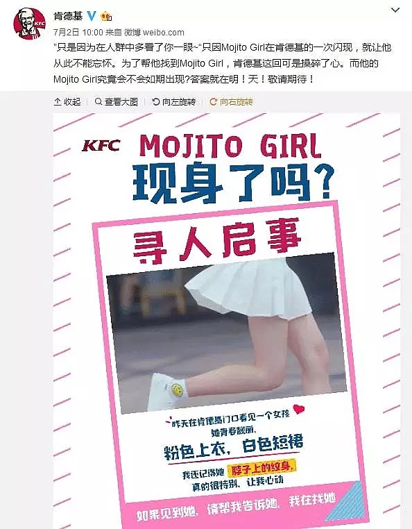 - 2017年7月21日前段时间,KFC在杭州万象城开出了一家绿意盎然的KPRO,店内加入小龙虾、蔬菜沙拉、超日啤酒等颠覆性餐品。近日,KFC在微博上宣布,门店现在又推出了一款名叫“MojitoGirl”的特饮,魔性的宣传广告又吸引了大批消费者关注。饮料整体为粉色色调,是一款青金桔+新鲜薄荷叶+树莓风味朗姆酒的无酒精鸡尾酒特饮,中文名为莫吉托女孩。该饮料一经推出,购买过的顾客对其态度褒贬不一。肯德基试水新门店欲瓜分小龙虾...