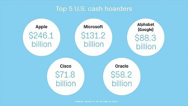- 2017年7月20日腾讯证券讯据CNNMoney报道,苹果、谷歌和微软公司持有巨额的现金,同时缴纳的税款很低。穆迪周三发表的报告显示,这三大巨头去年年底持有的现金总额高达4640亿美元。得益于数年庞大的利润和几乎没怎么进行过收购,苹果公司现有2500亿美元现金,足以买下三个柰飞公司(Netflix)。除了科技和医疗保健行业之外,苹果比其他各个主要行业的公司拥有的现金总量都多。穆迪的报告显示,非金融企业去年年底现金收入...
