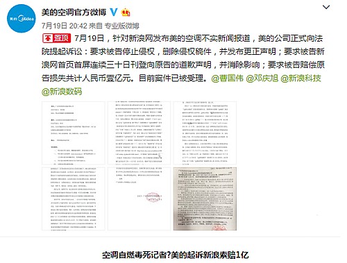 - 2017年7月20日7月19日晚间,美的空调官方微博发布消息称,针对新浪网发布美的空调不实新闻报道,美的公司已正式向法院提起诉讼,并索赔1亿元。上周,《体坛周报》的篮球记者李淼意外去世事件的消息引发了大量关注,7月16日,新浪科技援引体坛快讯消息称,李淼因空调自燃散发毒气引起窒息身亡。随后新浪数码在当日发布了《疑似美的空调自燃致体育记者早逝其中隐患你了解吗》一文,报道称据官方消息称,该记者的离世是由于在家中休息时,客...