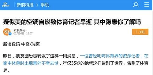 - 2017年7月20日美的空调在新浪微博上宣布起诉新浪……事情源起于体坛周报记者因空调自燃引起窒息身亡一事。7月16日下午,新浪科技和新浪数码以《疑似美的空调机柜自燃致体育记者早逝,其中隐患你了解吗?》(后标题改为“疑似美的空调机柜自燃致一名35岁体育记者中毒早逝”)为题报道了此事。文章中新浪表示他们接到爆料,称本次事故产品为美的空调。报道发布后又经新浪科技、新浪数码等官微转发,即刻引起了轩然大波。尽管美的空调随后在官...