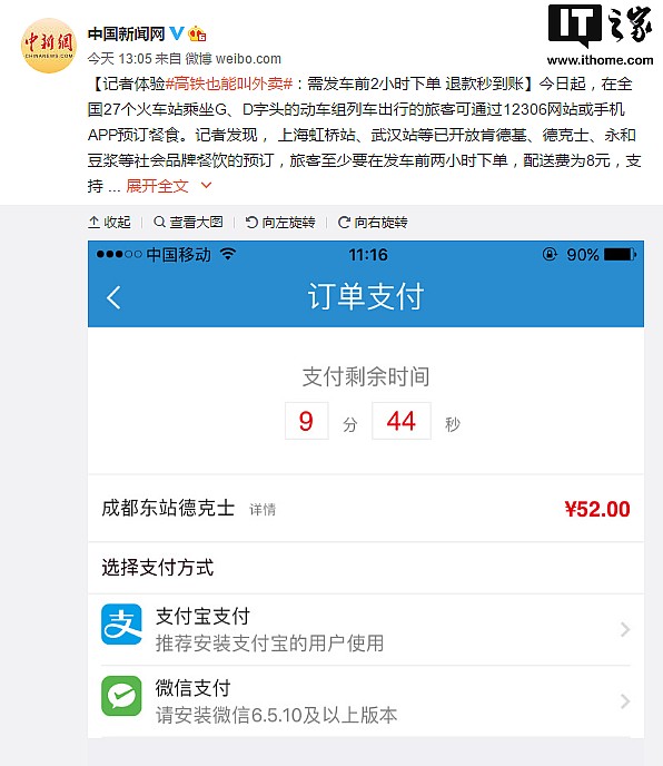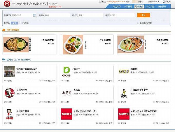 - 2017年7月20日IT之家7月17日消息根据此前中国铁路总公司发布的消息,铁路部门在各省会及计划单列市所在地的27个主要高铁客运站推出动车组列车互联网订餐服务,今天上午,12306官网订餐系统迎来更新,坐高铁终于能用手机或者12306官网订餐了。旅客订票时以及订票后都可以通过12306网站订餐、手机APP等方式预订,既可订所乘列车餐车供应的餐食,也可预订沿途供餐站供应的社会品牌餐食,支持支付宝和微信支付。据中国新闻...