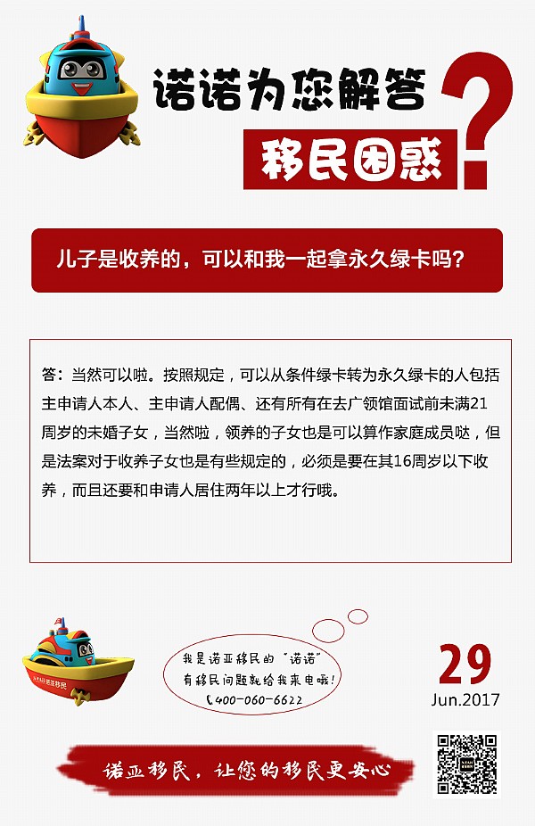 - 2017年7月17日问:儿子是收养的,可以和我一起拿永久绿卡吗?答:当然可以啦。按照规定,可以从条件绿卡转为永久绿卡的人包括主申请人本人、主申请人配偶、还有所有在去广领馆面试前未满21周岁的未婚子女,当然啦,领养的子女也是可以算作家庭成员哒,但是法案对于收养子女也是有些规定的,必须是要在其16周岁以下收养,而且还要和申请人居住两年以上才行哦。...