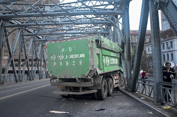 - 2017年7月13日4月25日晨5:00左右,一辆车号沪DP9929的土方车由南向北驶上外白渡桥时,车辆突然失控,一头撞向右侧外白渡桥钢架。在现场,绿色土方车车头已严重变形,挡风玻璃整个不见了,外白渡桥一根钢架被撞变形,一段护栏被撞断,地上满是碎玻璃和被撞飞的桥护栏,撞落的车顶灯标着“勤顺”两字。所幸的是由于时间尚早,没有造成人员伤亡,事故具体原因还在调查处理中。土方车撞上外白渡桥东侧桥体。车头受损,严重变形。...