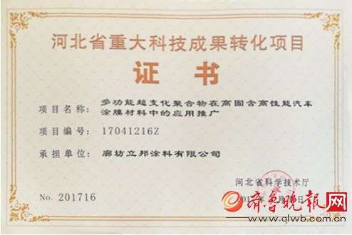 - 2017年7月10日原标题:廊坊立邦成功申请河北省重大科技成果转化项目齐鲁晚报7月06日讯:随着供给侧结构性改革的深入推进,我国经济正由低端竞争的“中国制造”向中高端的“中国质造”和“中国智造”转型。对此,国务院在2015年印发了《中国制造2025》,以制造业的绿色升级、智能制造、高端装备创新为三大方向,全面部署并推进制造强国战略。立邦积极响应国家战略,2016年7月开始申报“多功能超支化聚合物在高固含高性能汽车涂膜...