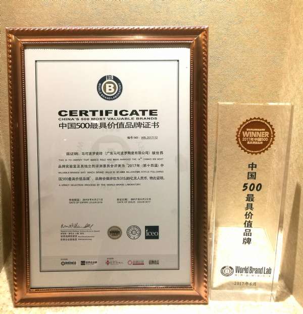 - 2017年7月10日2017年6月22日,2017(第十四届)“世界品牌大会(WorldBrandSummit)暨中国500最具价值品牌发布会”在北京举行。会上,世界品牌实验室发布了《中国最具价值品牌500强》榜单,马可波罗瓷砖以315.89亿品牌价值,名列榜单第112位,继续位列建陶行业第一!自此,马可波罗瓷砖已连续十四年入选“中国最具价值品牌500强”,并且连续六年位列建陶行业榜首!马可波罗瓷砖代表上台领奖世界品...