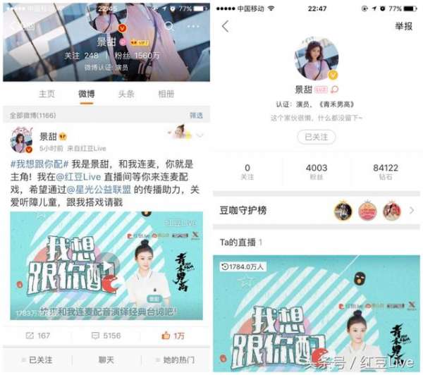 - 2017年7月9日7月5日,人气女演员景甜献声红豆Live语音直播,参与由红豆Live与微公益、星光公益联盟联合发起的“我想和你配”大型公益直播活动。在直播中,景甜一改女神形象,非常放松、接地气的与粉丝聊天,更是连唱《水晶》、《告白气球》、《晴天》等多首歌曲,不仅进一步的拉近了与粉丝的距离,更令很多网友路转粉。此次景甜直播最终的连麦收入与礼物打赏将全部通过微公益平台捐赠给中国听力医学发展基金会,援助80万听障儿童。...