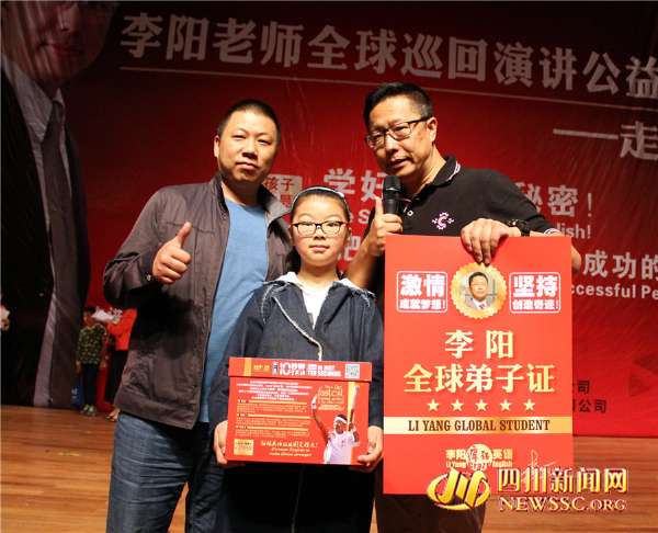 - 2017年7月8日4月16日,李阳老师现在为一名学生颁发《弟子证》后,与孩子和家长合影。四川新闻网网广安4月17日讯(田祖国?羽文/图)4月16日,李阳疯狂英语全球巡回公益演讲报告会走进广安,“李阳疯狂英语”创始人李阳老师亲亲临现场主讲,让广安2000余多名学生和家长感受了“疯狂英语”的独特魅力。整个演讲围绕英语学习、坚持学习英语、励志等主题展开,包括英语演讲,对学生读英语、学英语方面的兴趣激发训练等。李阳用风趣幽...