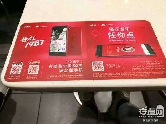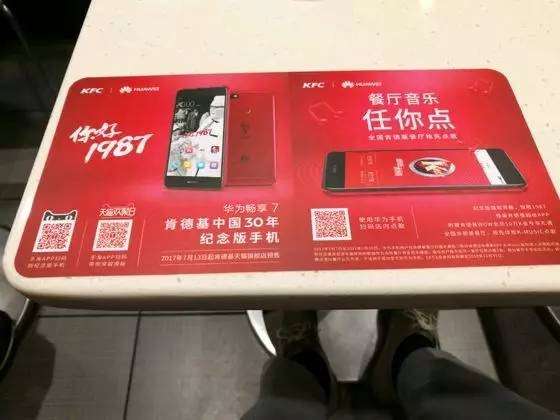 - 2017年7月8日\u00A0\u00A0\u00A0\u00A0楚天金报讯\u00A0图为:华为“畅享7”后壳印有肯德基纪念版镭射图案\u00A0\u00A0\u00A0\u00A0金报讯(记者周萍英)不创造不时代,7月7日,华为“畅享7”肯德基中国30年纪念版正式亮相,全球限量销售,这也是华为与肯德基中国的首度牵手。消费者在肯德基用餐,可用华为手机实现餐厅背景音乐自由点。\u00A0\u00A0\u00A0\u...