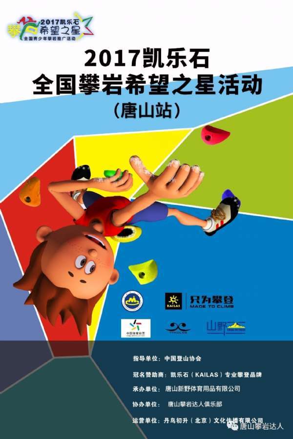 - 2017年7月4日原标题:7月8日攀登吧,孩儿--2017年凯乐石希望之星全国青少年攀岩推广活动(唐山站)唐山攀岩达人俱乐部启动仪式暨唐山青少年攀岩队队员选拔赛7月8日,苍穹下的唐山攀岩达人俱乐部,小达人们将在这里再一次的拼搏绽放。指导单位:中国登山协会承办单位:唐山新野体育用品有限公司协办单位:唐山攀岩达人俱乐部活动地点:唐山市路北区新华道与卫国路交汇处北行150米道东沃爱华健身工厂店内唐山攀岩达人俱乐部比赛项目...