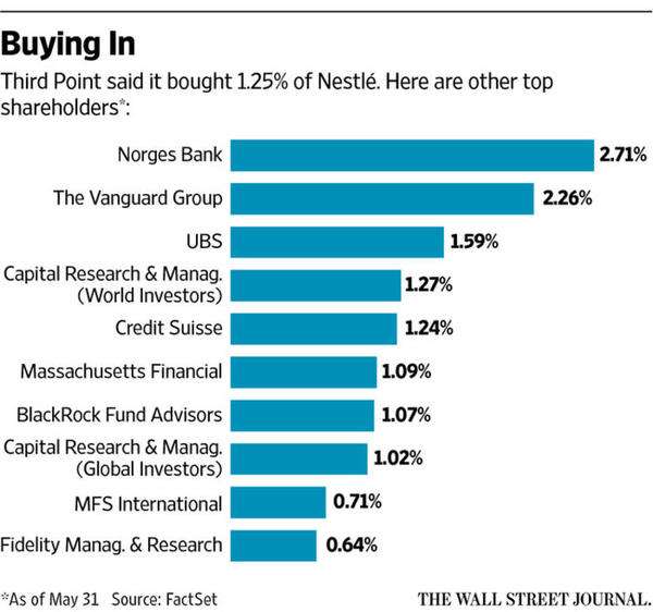 - 2017年6月30日全球最大食品公司雀巢近日被推到聚光灯下。著名激进投资者、对冲基金大佬丹尼尔·勒布(Daniel\u00A0Loeb)旗下的第三点对冲基金(Third\u00A0Point\u00A0hedge\u00A0fund)25日宣布其斥资35亿美元入股雀巢,持股1.25%,成为雀巢第六大股东。在对冲基金业界,丹尼尔·勒布以擅长倒逼上市公司改革闻名。刚一入股雀巢,勒布便公开建议雀巢出售公司持有的23.2%欧...