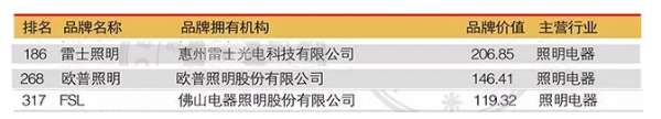 - 2017年6月28日6月22日,由世界品牌实验室组织评选的2017“中国500最具价值品牌”榜单在北京揭晓。在这份基于财务数据、品牌强度和消费者行为分析的年度报告中,国家电网(3298.87亿元)、腾讯(3251.12亿元)、海尔(2918.96亿元)名列榜单前三名。本年度《中国500最具价值品牌》排行榜中,共有来自食品饮料、纺织服装、文化传媒、信息技术、家用电器等在内的25个相关行业的品牌入选。其中照明行业有雷士照...