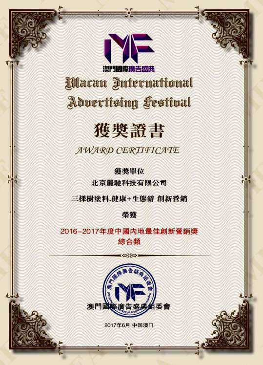 - 2017年6月28日(原标题:三棵树健康+生态游荣膺澳门国际广告盛典“内地最佳创新营销奖”)6月6日,由澳门广告商会、澳门国际广告节组委会主办的首届澳门国际广告盛典隆重举行,三棵树第三季“健康+生态游”网络推广活动荣膺“2016-2017年度中国内地最佳创新营销奖”。据了解,澳门国际广告盛典得到了中国广告协会的鼎力支持,来自中国内地、港澳台、韩国、日本、马来西亚、新加坡、越南、柬埔寨等十几个国家的上千名广告界代表齐聚...