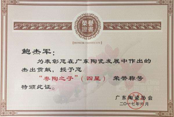 - 2017年6月24日\u00A0\u00A0中国陶瓷网讯6月2日,主题为“绿色引领创新发展”的2017年广东省陶瓷行业年会暨广东省陶瓷协会会员大会广州鸣泉居度假村召开,欧神诺陶瓷股份有限公司董事长鲍杰军喜获第二届“粤陶之子”四星荣誉勋章。欧神诺陶瓷股份有限公司集团董事长获授“粤陶之子”荣誉勋章\u00A0\u00A0据悉,首届“粤陶之子”的授勋是在十年前,十年来,广东陶瓷行业取得巨大发展,也涌现出新的一批为陶瓷事业做...