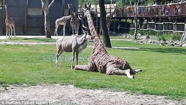 - 2017年6月24日原标题:稀奇!荷兰动物园羚羊勇敢挑战高大长颈鹿【环球网综合报道】据英国《每日邮报》6月15日报道,近日,荷兰鹿特丹动物园发生了令人意想不到的一幕:一只羚羊大胆袭击了一只长颈鹿。事发突然,周围的游客都感到无比震惊,有人拍摄下了当时的画面并将其发布至视频分享网站YouTube,至今阅读量已超过30万。视频中,只见一只长颈鹿悠闲地躺在草坪上晒太阳,突然,一只羚羊靠近它,用其羊角顶这只长颈鹿。然后,这只长...