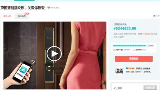 - 2017年6月22日(原标题:顶固D1智能锁众筹600万完美收官,不忘初心感恩前行)2017年6月20日,对于世界来说是一个再平常不过的周二,但对于顶固来说却是一个极具纪念意义的日子。随着时钟的指针跳向00:00,顶固灵动D1智能锁众筹正式落下帷幕,页面上灰色的结束按钮,将一切定格在了这一刻,以6009493.80的佳绩完美收官!这一刻,没有想象中的欢呼,没有想象中的拥抱,这一刻,我们甚至有点梗咽。2017年5月20...