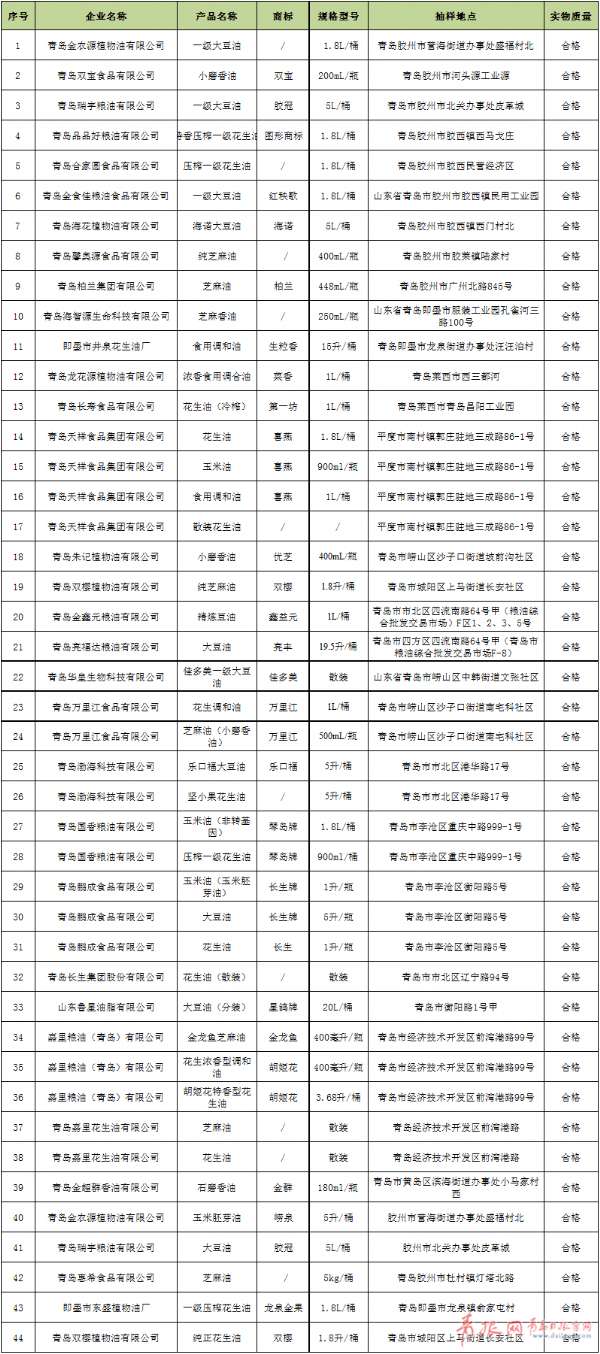 - 2017年6月21日青岛市食药局20日发布2017年食用植物油生产企业抽检情况的通告,通告显示,此前市食药局对青岛市食用油生产企业的监督抽检共抽检44批次,其中包括胡姬花、金龙鱼等市民熟悉的品牌,抽检结果全部合格。据悉,市食药局近期组织对食用植物油生产企业进行了监督抽检,抽样检验项目为酸值、过氧化值、溶剂残留量、黄曲霉毒素B1、苯并比、脂肪酸组成等。抽检样品包括青岛长生集团股份有限公司生产的散装花生,嘉里粮油(青岛)...