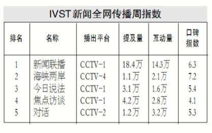 - 2017年6月21日\u00A0\u00A0\u00A0\u00A0在本周新闻节目全网传播指数排行榜中,《新闻联播》播出我国与巴拿马于北京时间6月13日宣布正式建立外交关系,备受瞩目。《今日说法》曝光多地“月子会所”从业者不规范经营甚至违法经营的乱象,引发观众关注。《焦点访谈》聚焦城市为残障人士进行无障碍设施改造的现状与问题,同样引发热议。\u00A0\u00A0\u00A0\u00A0在本周电影全网传播指数排行榜中...