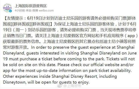 - 2017年6月19日(原标题:19日上海迪士尼现场停售当日票)原标题:上海迪士尼明天现场停售当日票[群体围观]据上海发布,#便民提示#@上海国际旅游度假区说:为保证上海迪士尼乐园的游客体验,计划于6月19日(周一)到访乐园的游客,需要提前购买门票,当天现场售票亭将停止销售当日门票。上海迪士尼度假区的其它景点包括迪士尼小镇等将照常对游客开放。(原标题:19日上海迪士尼现场停售当日票)...