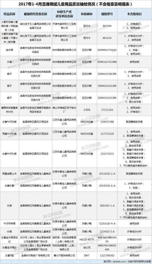 - 2017年6月15日原标题:宜昌工商管理局童装抽检HelloKitty迪士尼等品牌不合格近日,宜昌市工商行政管理局发布了2017年1-4月流通领域商品质量抽检情况,结果显示,19批次童装抽检不合格,其中HELLOKITTY、迪士尼等多品牌上黑榜。为了加强流通领域商品质量监管,依据点单式抽检问卷和2017年1季度消费者投诉的重点商品种类等情况,宜昌市工商局于2017年1月至4月对西陵区、伍家岗区、高新区范围内文体用品、...
