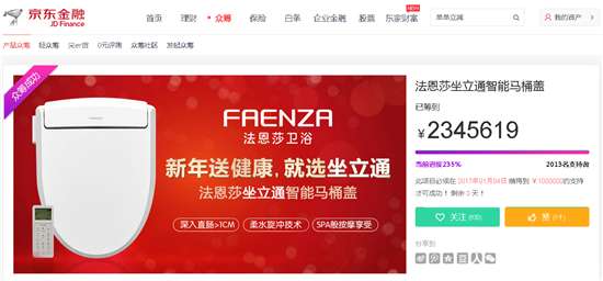- 2017年6月15日【导读:法恩莎卫浴通便智能马桶盖“坐立通”首次众筹大获成功,众筹金额2345619元,夺魁京东众筹智能马桶盖众筹榜!】首尝众筹便刷新行业记录此次众筹活动于2016年12月5日正式上线,目标任务100万,上线一周便已破百提早完成众筹任务,2017年1月4日众筹结束,最终成交额达2345619元,完成率高达235%,共获得2013人次支持,收集产品研发及咨询话题117个,刷新京东智能通便马桶盖众筹记录...