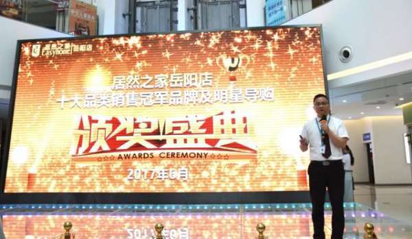 - 2017年6月13日6月7日上午9点,居然之家岳阳店近300家国内外一线建材家具品牌商户及导购齐聚一堂,为5月创下的卓越佳绩举行隆重的颁奖盛典!居然之家岳阳店副总经理张争锋先生对5月的整体销量进行了总结,感谢大家5月份的辛勤付出,并公布了十大品类销售冠军品牌及明星导购。在全场的注目及热烈的掌声中,居然之家岳阳店总经理梁钢先生为获奖品牌及导购颁发奖牌与奖金。瓷砖、洁具类冠军品牌:金玉名家\u00A0明星导购:谢\u00...