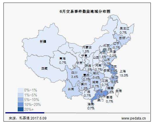 - 2017年6月11日截止本周五下午,投资、上市和并购共91起事件,涉及总金额200.67亿元人民币。从交易金额来看,涉及金额较大的事件是2017年6月9日,诚志股份有限公司通过增资的方式成功受让南京诚志清洁能源有限公司,作价25.71亿人民币。从交易事件地域分布看,目前主要分布在北京市、上海市和广东省,占比分别为28.47%,15.33%和13.14%。本周新三板市场共有39家企业挂牌,新增加股本为11.21亿股,本...