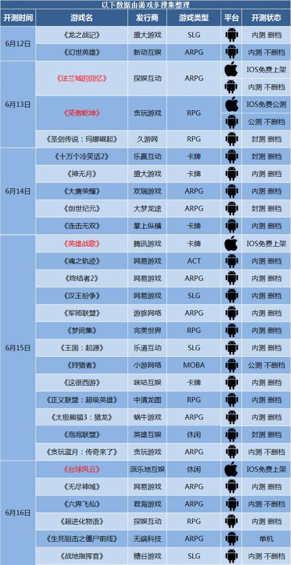 - 2017年6月9日亲爱的各位小伙伴们大家好啊,欢迎来到下周开测,本周莫名其妙过的异常艰辛,不过终于还是到周五啦,来看下周好玩的游戏吧!下周开测的游戏数量相对算不少,到神奇周四时爆发出高峰。下周安卓单端游戏占了八成以上的比例,几乎是前所未有的,iOS单端的游戏只有百分之七,就算加上较少的双端游戏,苹果用户能玩到的游戏也不足15%,大约只有四款。ARPG与RPG还是占大部分比例,其他类型的游戏比例相对增加,下周还有一款...