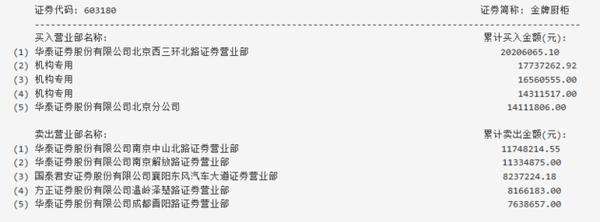 - 2017年6月8日5月24日,金牌厨柜继续震荡上行,盘中创了历史新高75.5元,在其公开交易席位中,再度出现了三家机构身影,分别买入1773.73万元、1656.06万元以及1431.15万元,继续加码买入。值得关注的是,金牌厨柜买入席位第一的位置被营业部占据,为华泰证券(601688)北京西三环北路营业部,该营业部买入金额达到2020.61万元,记者了解到,该营业部正是今年潜伏雄安概念、取得巨大投资收益的成泉资本...